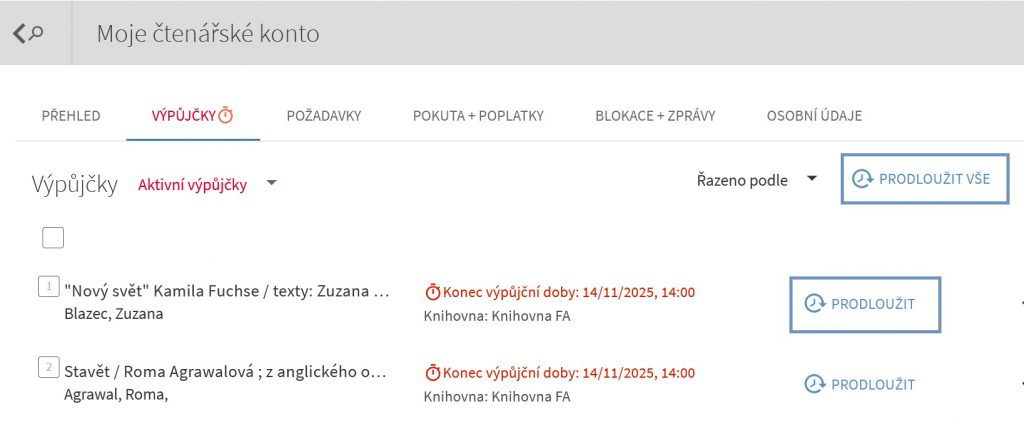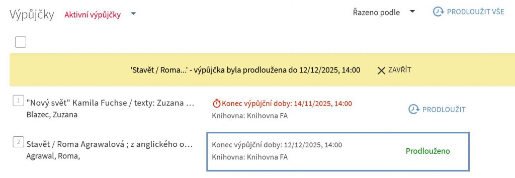 - zkontrolujte, zda prodloužení proběhlo v pořádku u všech vybraných výpůjček